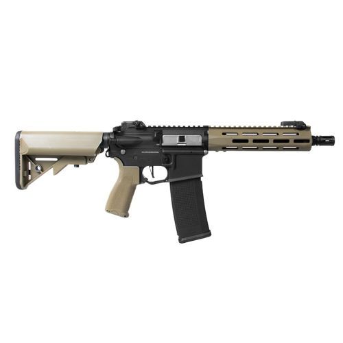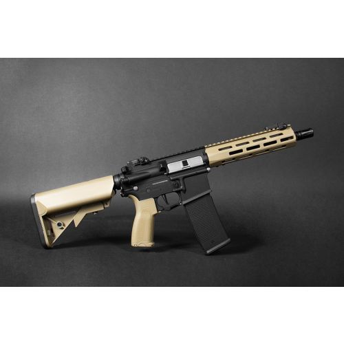 The rifle features the advanced CarbonTech™ technopolymer body and handguard in a sleek Black/Tan color scheme, delivering outstanding strength and impact resistance while keeping the overall weight remarkably low at just 2.3 kg. Its compact dimensions (655 mm retracted / 740 mm extended) make it highly manoeuvrable for CQB and versatile enough for outdoor skirmishes.