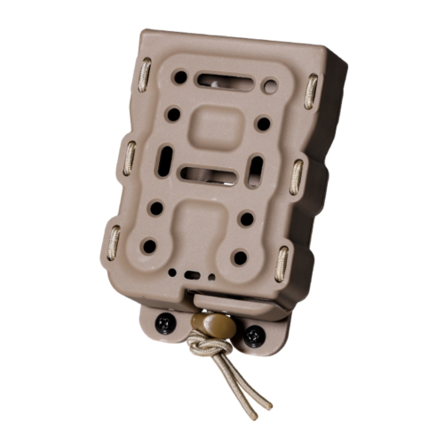 Made of resin, the Bite Mag holder uses Japan made polyamide for excellent impact resilience. The amount of retention is also fully adjustable via the shock cord straps on the back of the Bite Mag. The tapered opening of the Bite Mag holder also allows for easier and smoother drawing and reinserting of magazines. Lastly, installation is a breeze with the screw-in clips designed for the PALS webbing/MOLLE system. Simply slide the clips into your webbing, then screw in the mounts, no weaving, no buttons, simple and quick.
