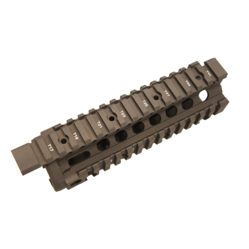 Fits standard Delta Ring without modification True Free float Integral QD Sling Swivel Mount with limited rotation Light weight Removable Lower Rail Oval Shape to feel like traditional Hand Guards Precision CNC machined from Airsoft grade Aluminium with Hard Coat Anodized. The Omega Rail weighs in at an amazing 8 Ounces.